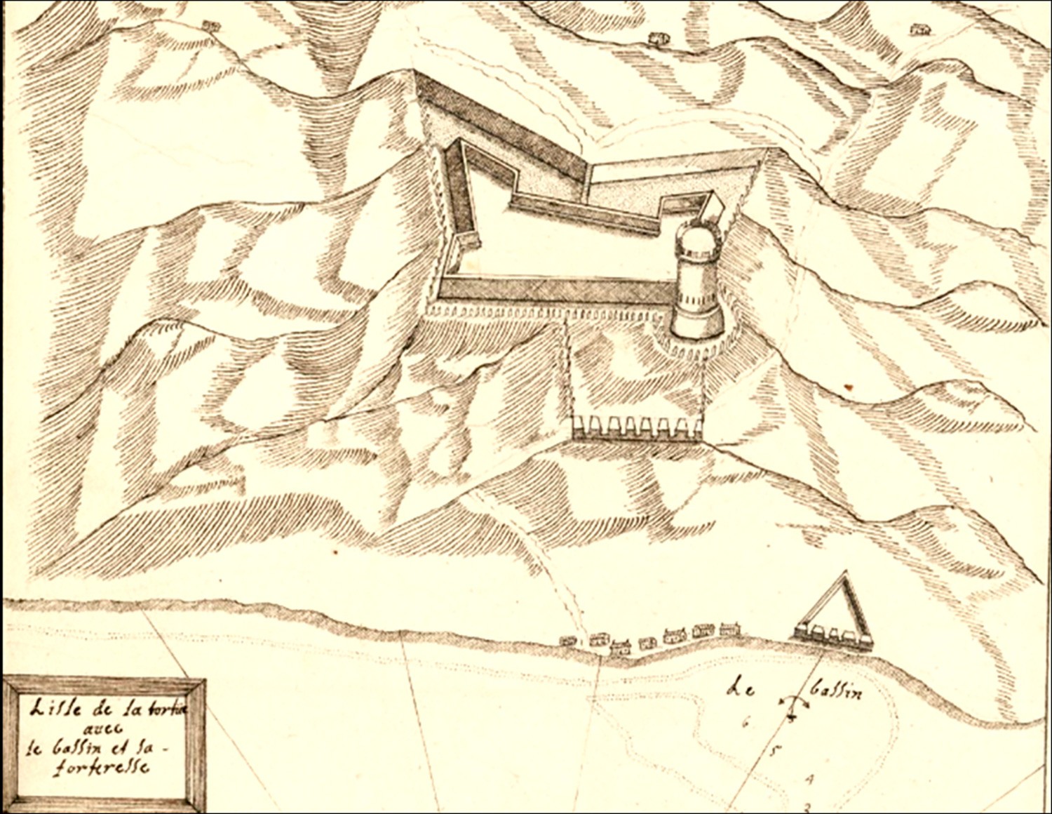 In 1666, engineer Blondel visits Tortuga Island and draws plans for a new fort below Fort de la Roche, closer to the bay. It is a circular tower that flanks a lower courtyard defended on the sea side by a curtain wall punctuated by firing embrasures, and on the land side, by a wooden palisade forming a curtain wall and half-bastions. Blondel initiates the work and then leaves the site. The fort will be completed by the end of the year 1668, as Sieur d’Ogeron had advanced personal funds to finish the construction. Blondel initiates the work and then leaves the site. The fort will be completed by the end of the year 1668, as Sieur d’Ogeron had advanced personal funds to finish the construction.